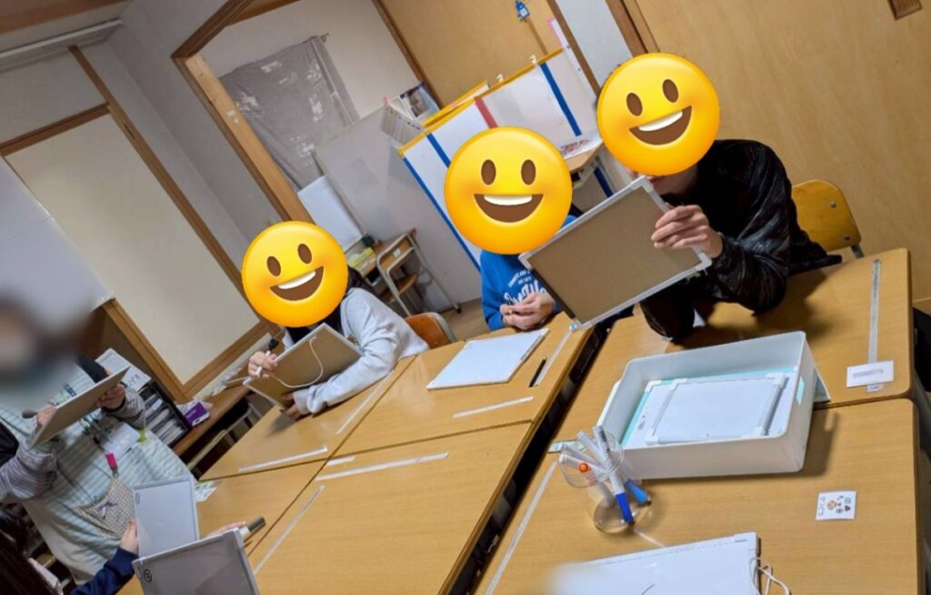 お題に合った3文字の言葉を考え、1文字ずつホワイトボードに書きます。